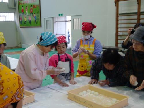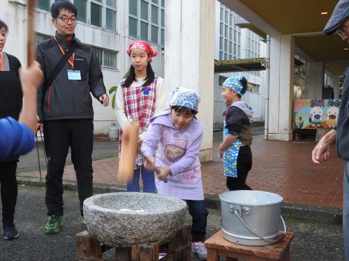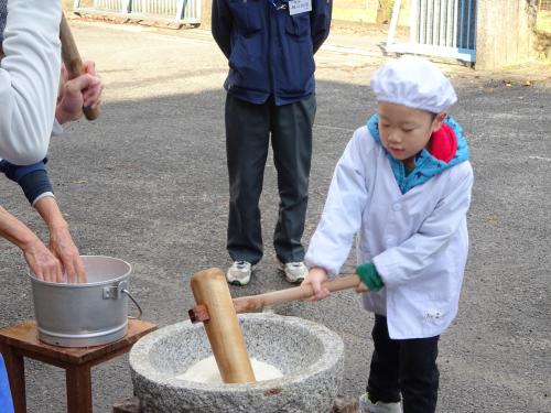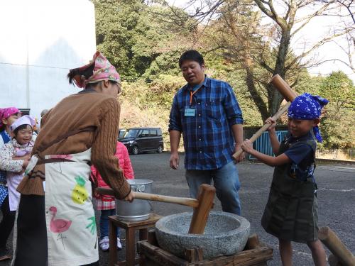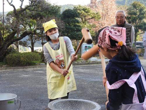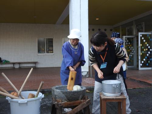 おじいちゃん、おばあちゃんとの息もピッタリ!(●^o^●)美味しいお餅がつけました!